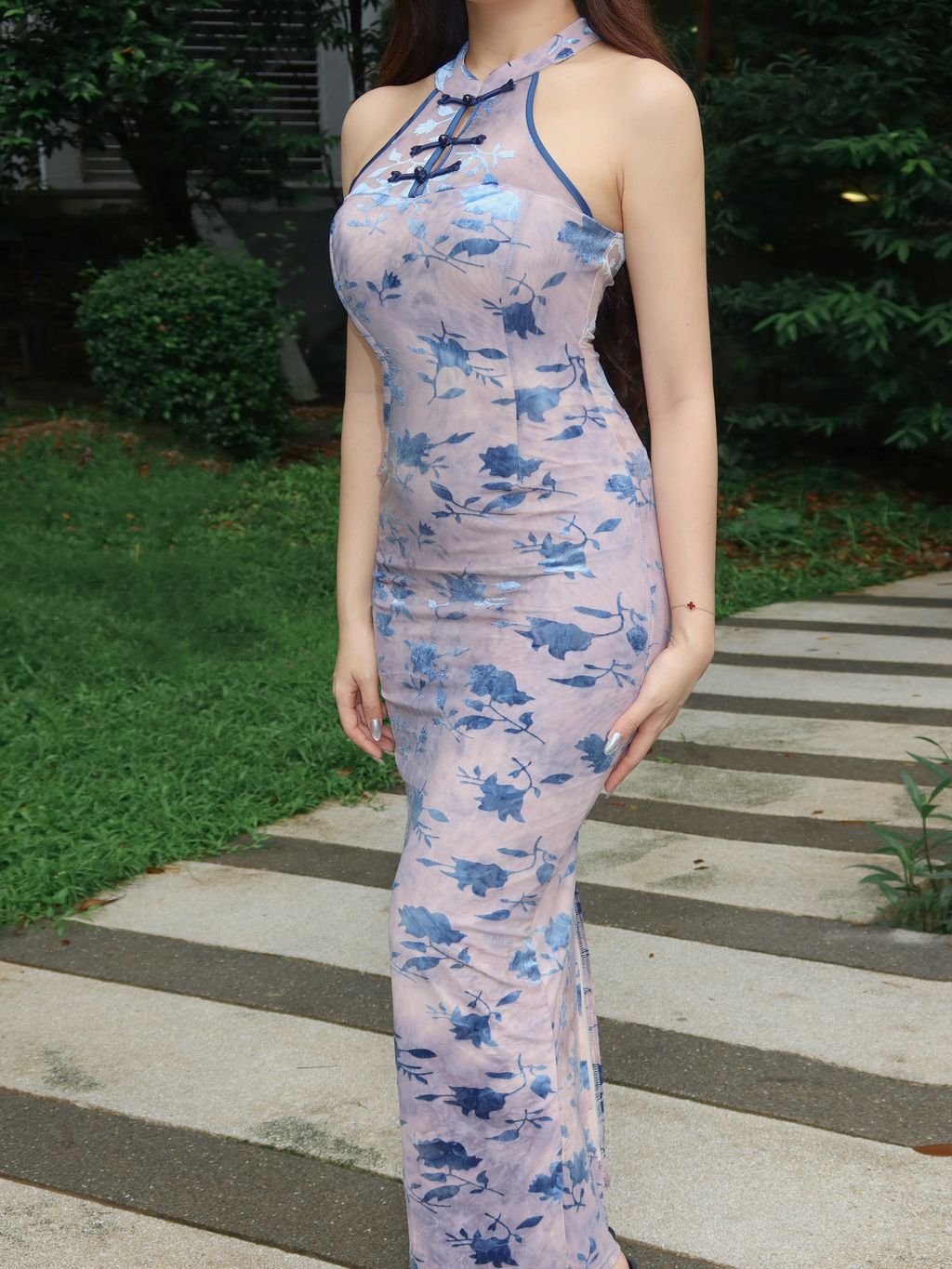 A modern maxi length cheongsam made from stretchable mesh with a blue-on-nude floral print. It comes with full lining so it’s non–see-through, has built-in padding, and a back zip for easy wear. Elegant, flattering, and comfortable.