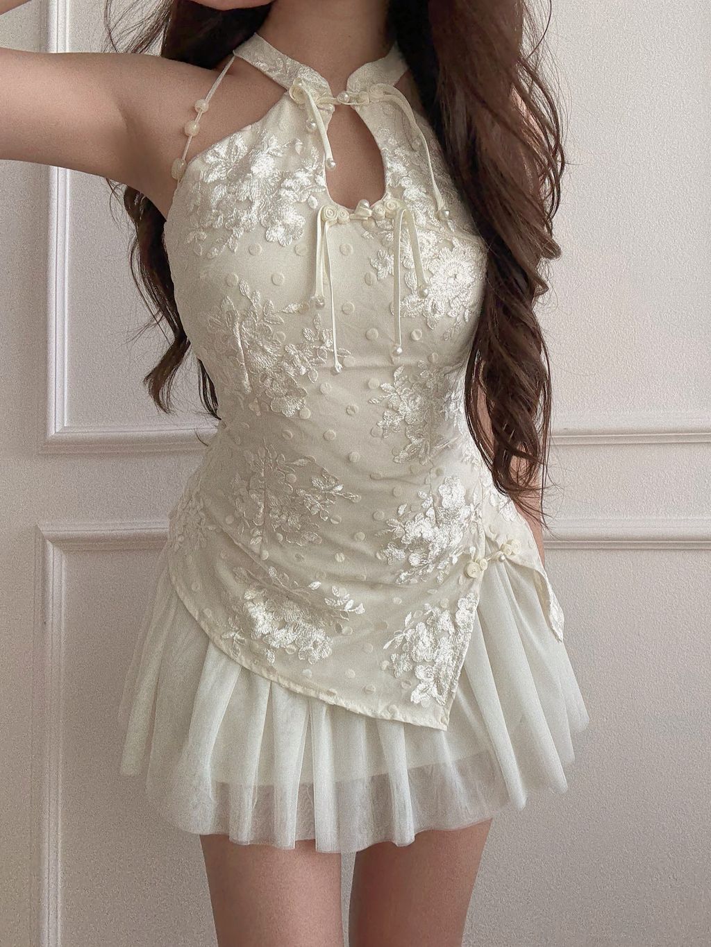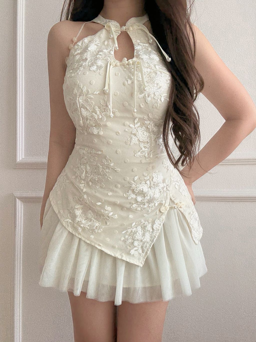 Jenise Floral Mesh Fake Two Piece Cheongsam Dress