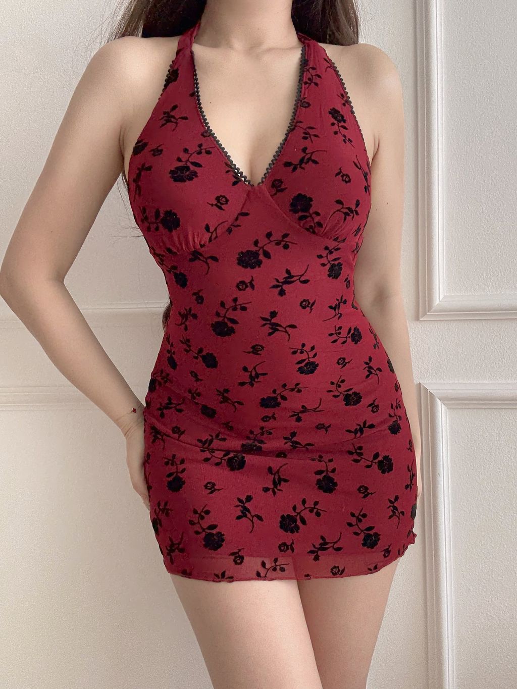 Cute halter neck dress made of velvety material, has an adjustable tie and is highly stretchable.