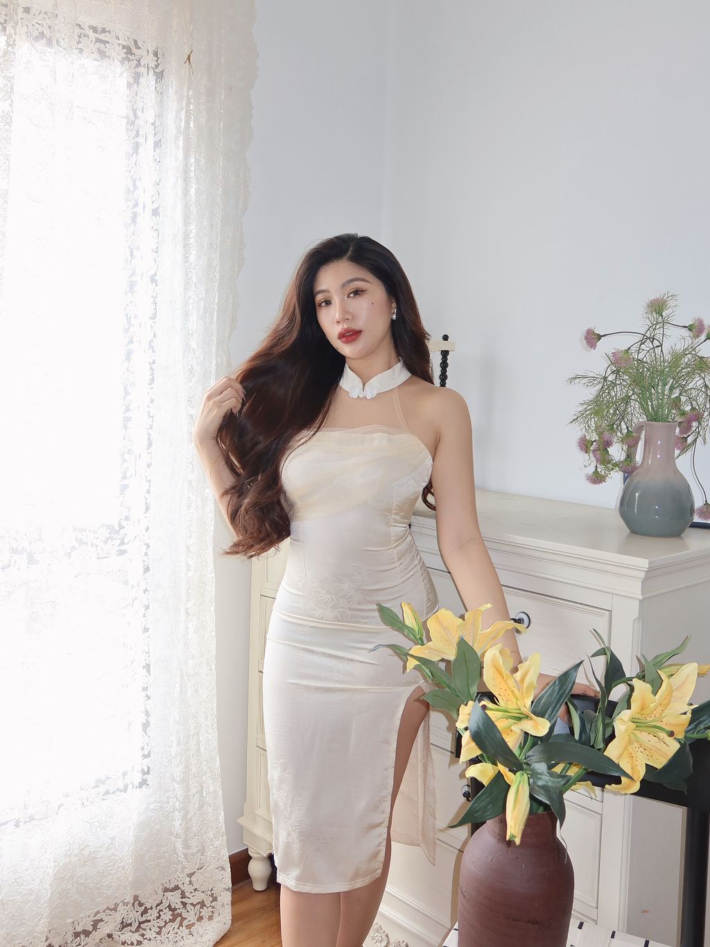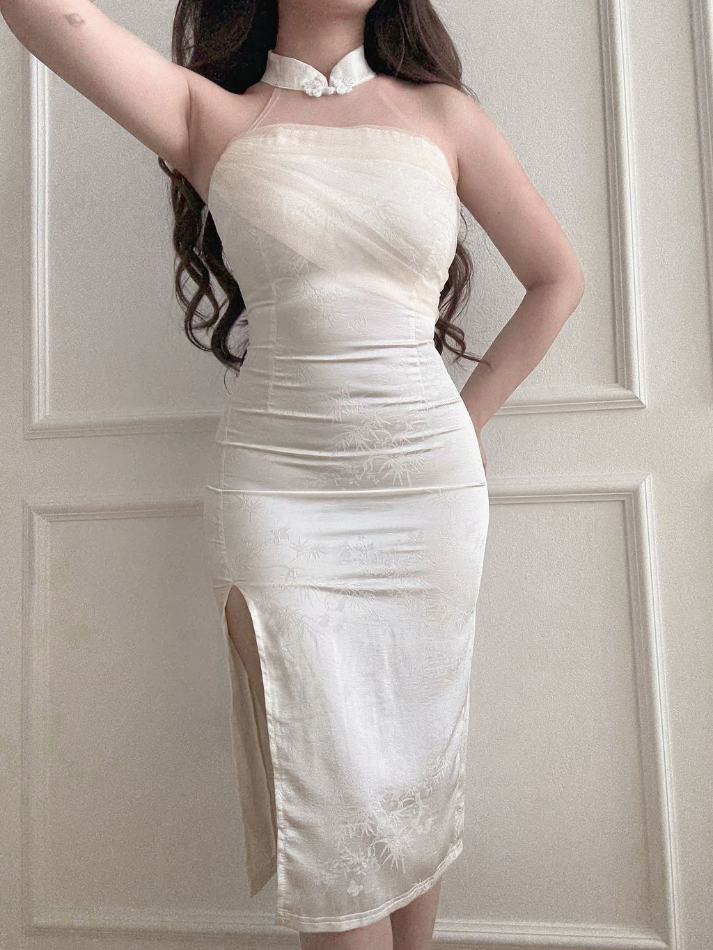 A super gorgeous piece with elastic material, has a great midi length that elongates the whole figure, has a mesh see-through collar design.