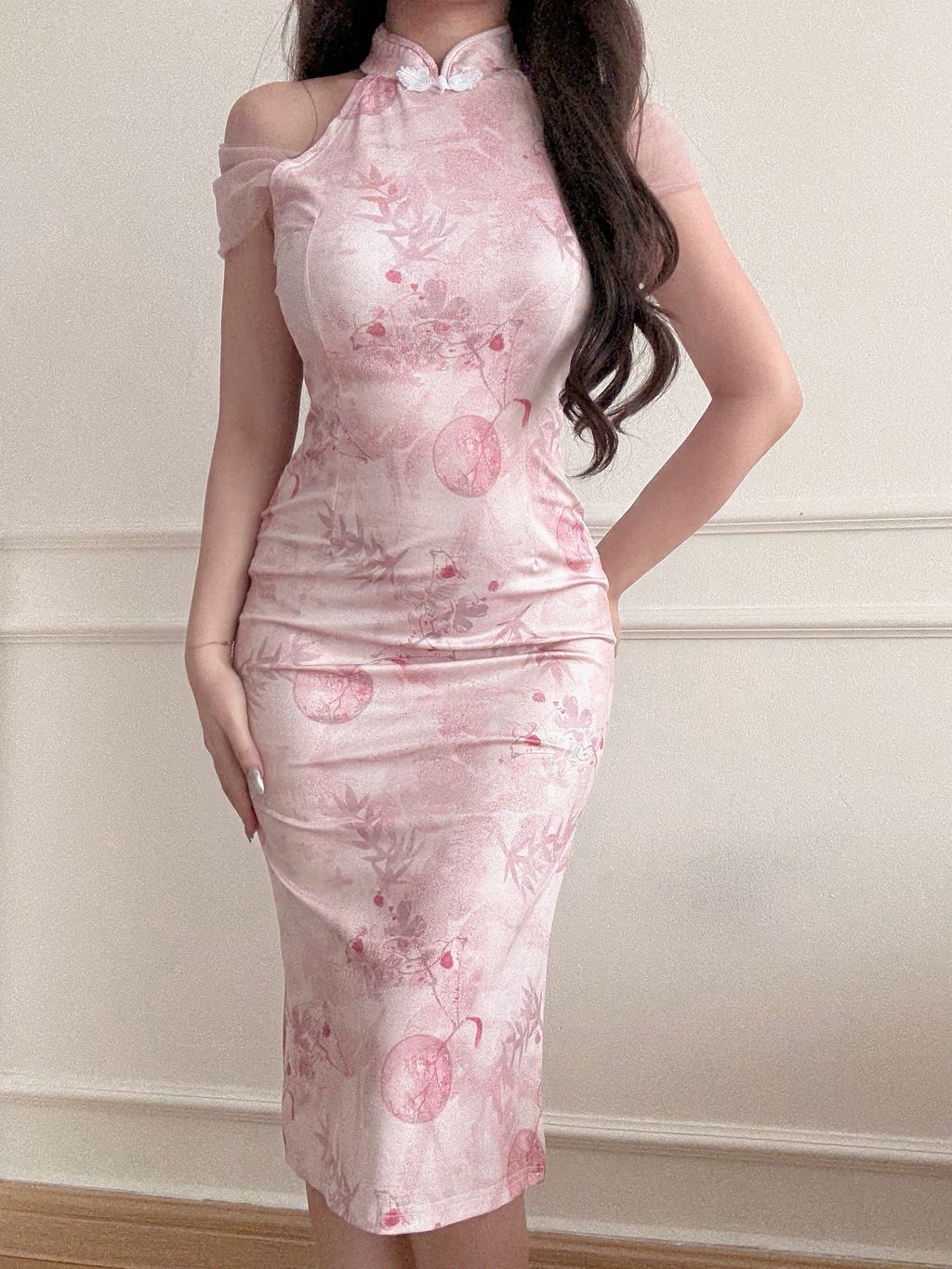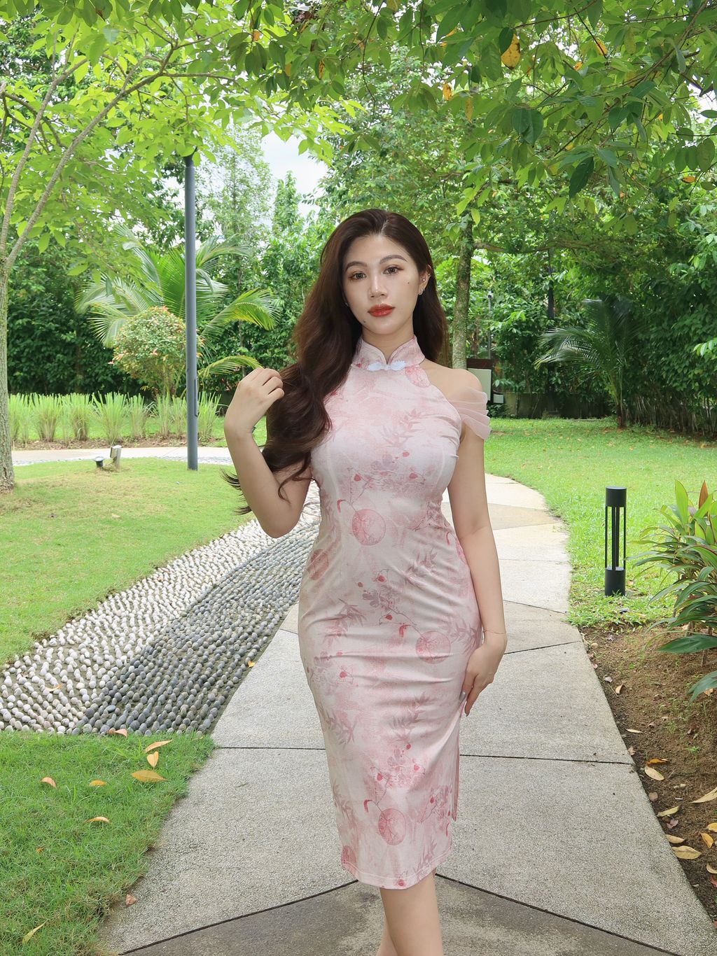 A unique, cute yet elegant cheongsam with mesh off shoulder detailing, is highly stretchable and has a great cutting.
