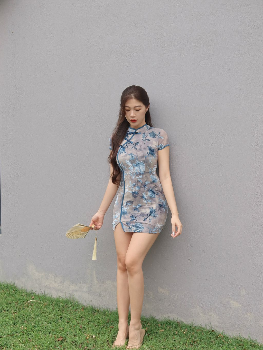A modern cheongsam made from stretchable mesh with a blue-on-nude floral print. Highly stretchable and has a back zip for easy wear. Elegant, flattering, and comfortable.