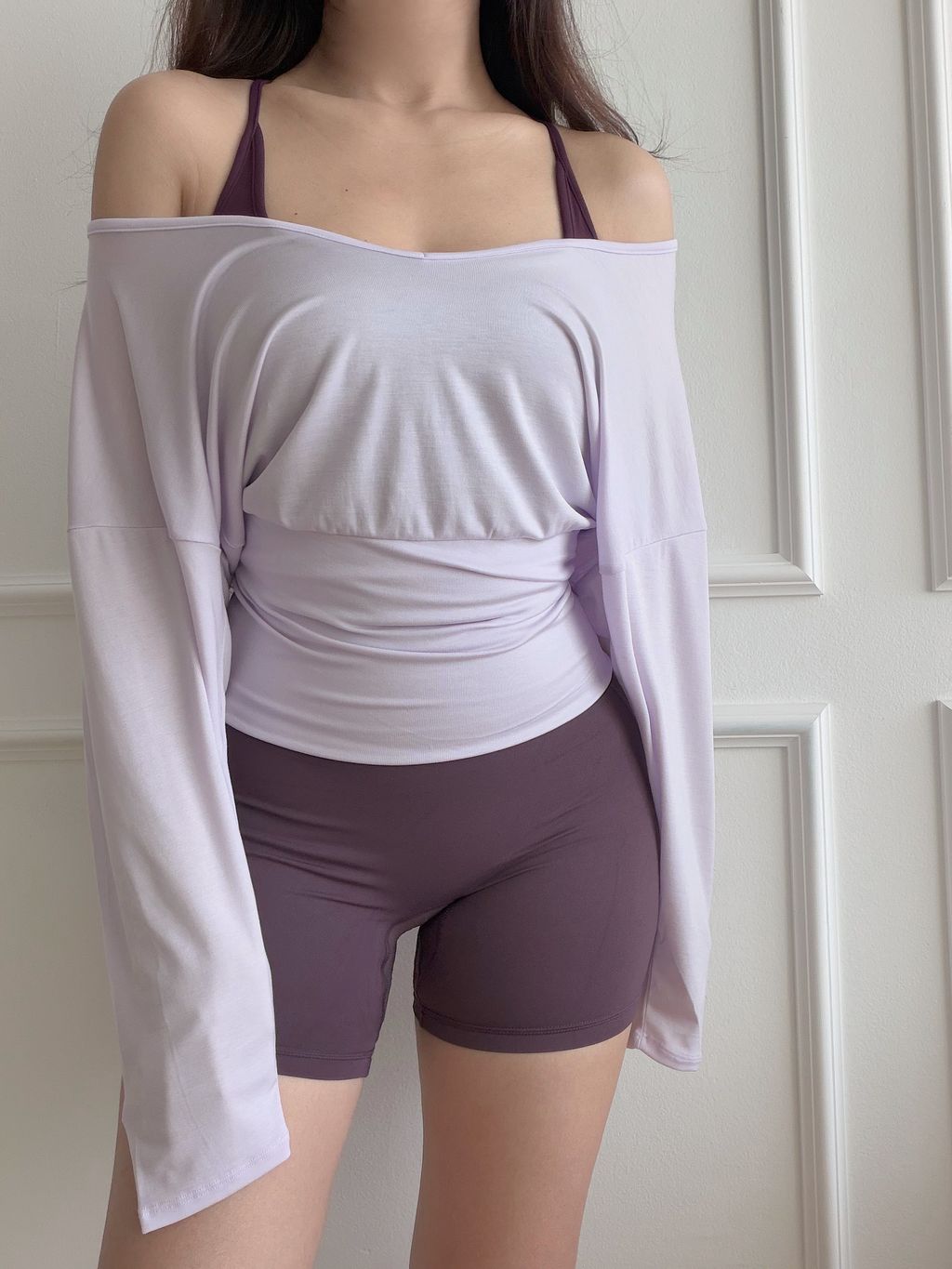 An ultra-lightweight workout cover-up designed for effortless layering. It features a relaxed off-shoulder silhouette with a soft, fluid drape that moves with your body. Made from breathable, quick-dry fabric, it keeps you cool and comfortable before, during, and after your workouts. Easy, airy, and flattering, perfect to throw on over your active set for that elevated off-duty look.