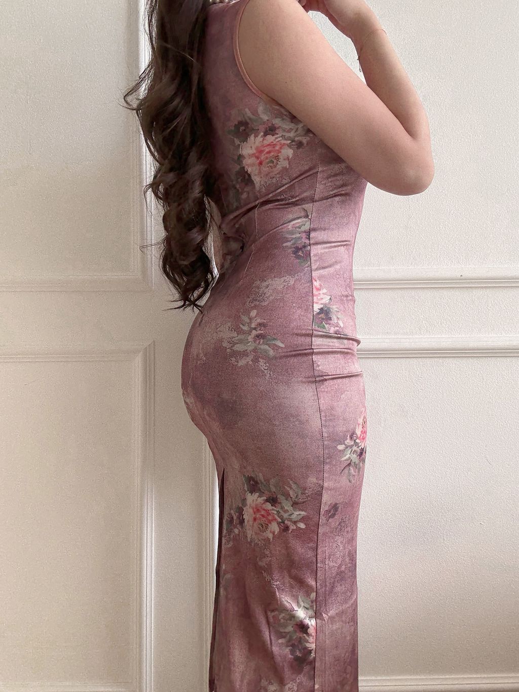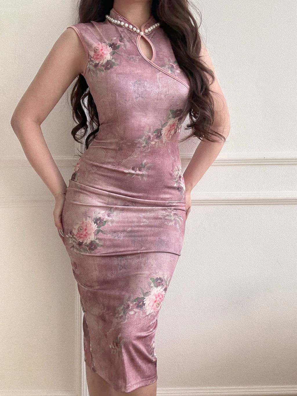 An elegant piece with floral prints and has a side slit, stretchable material and has a ruched waist design. Also has an unique pearl collar and keyhole detailing.
